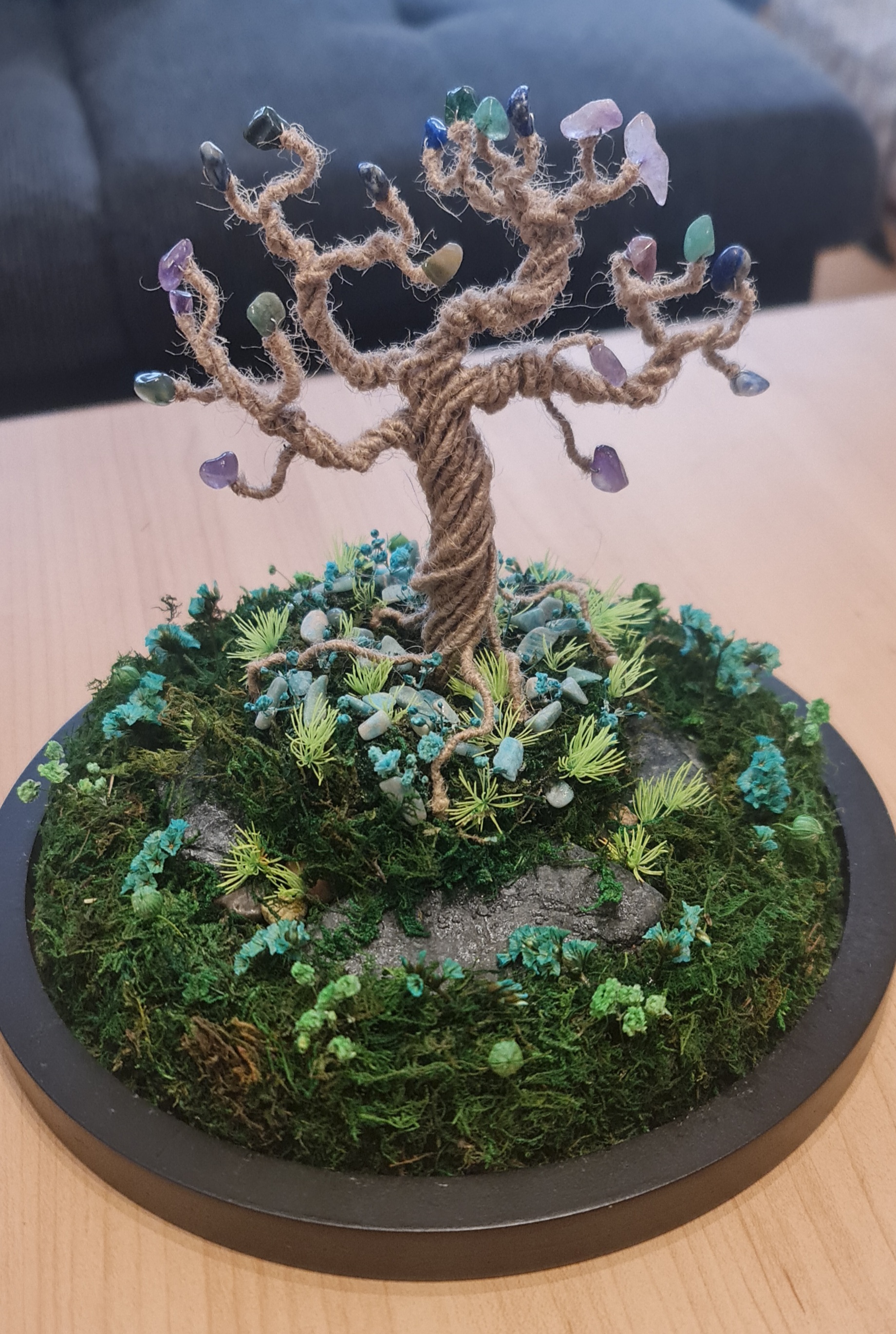 Petit arbre en fil de fer et pierres décoratives sur rondin de bois d'environ 7cm de haut sur 9cm de large.