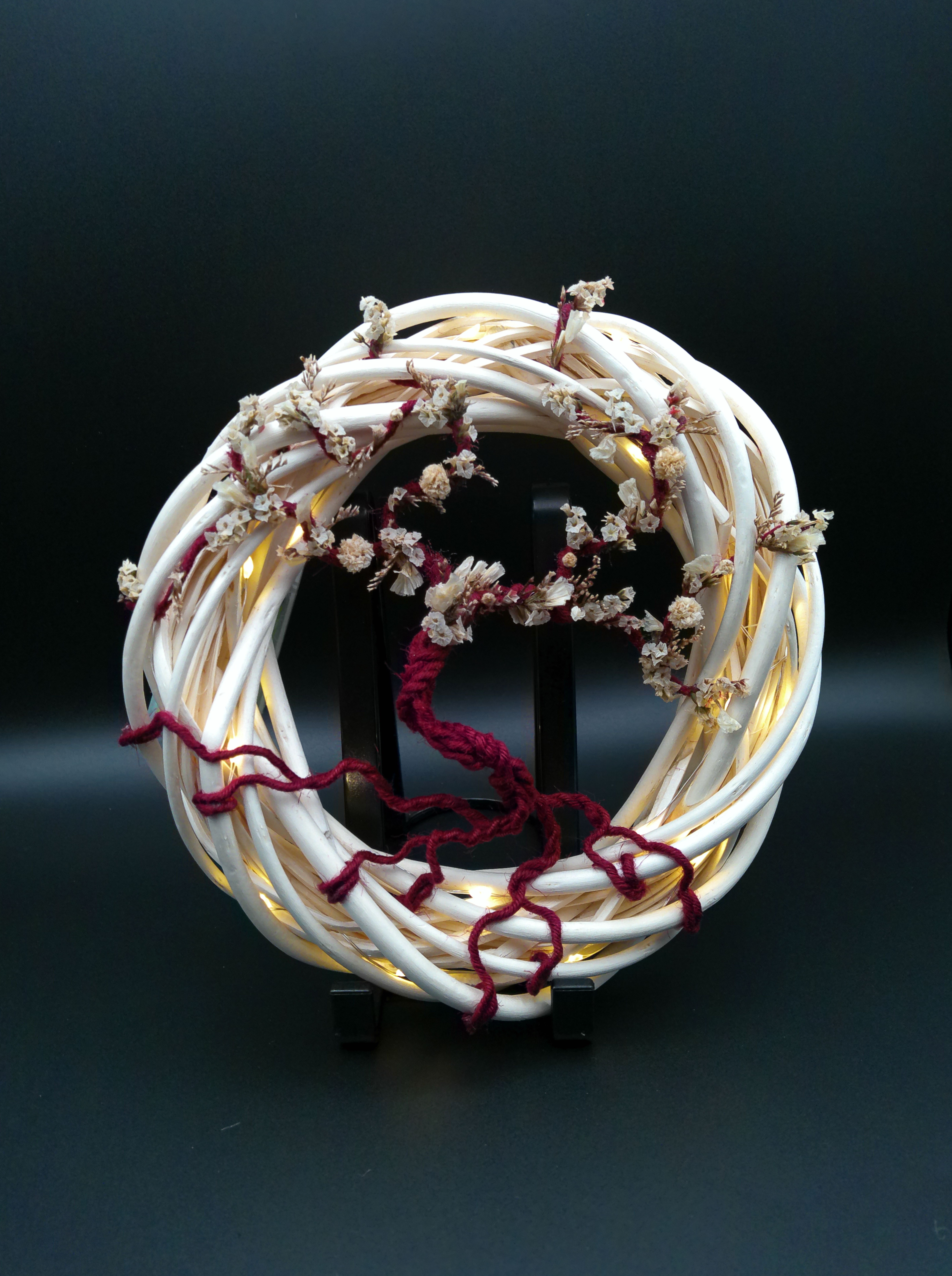 Arbre en fil de fer gainé de laine rouge sur cercle en osier d'environ 20cm de diamètre. Intégration d'une guirlande lumineuse (2 piles LR6 AA) + de petites fleurs séchées. Crochet à visser pour accroche murale fournit en plus.