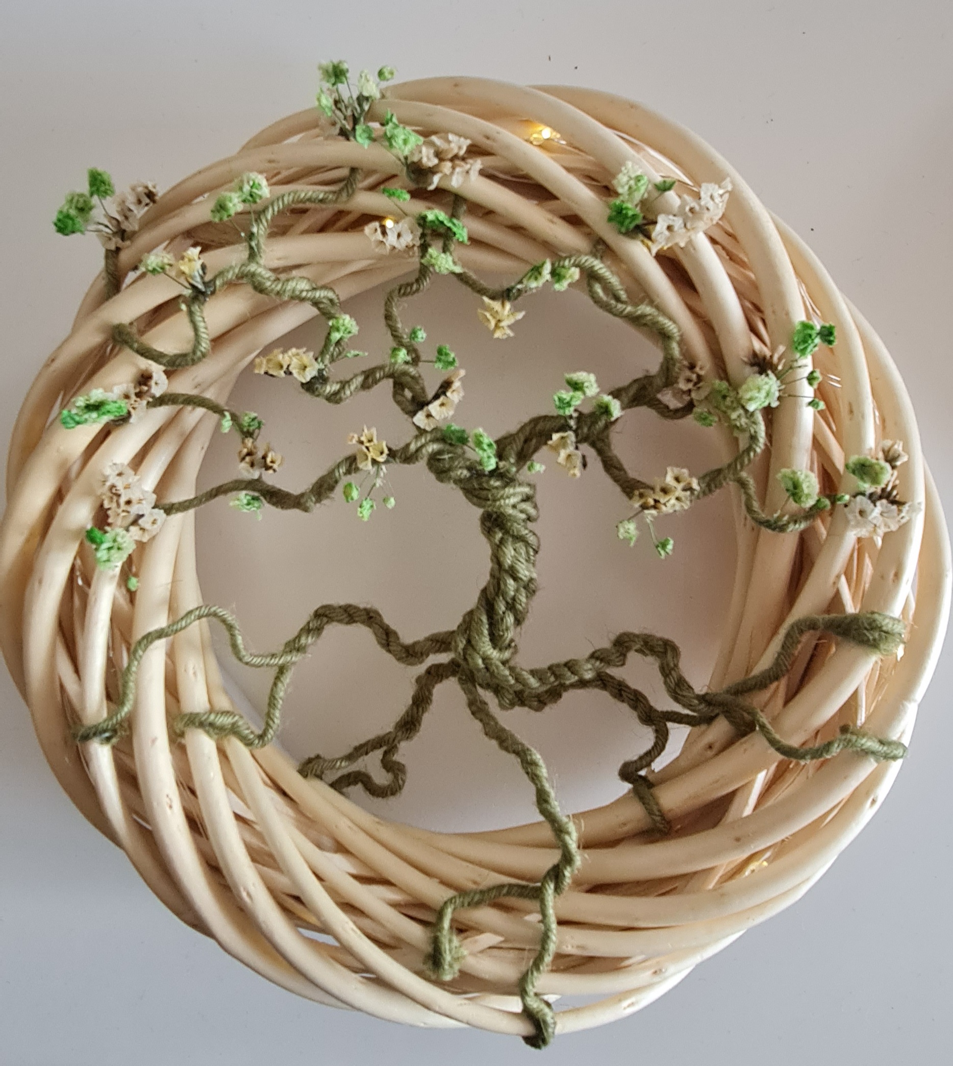 Arbre en fil de fer gainé de laine verte sur cercle en osier d'environ 20cm de diamètre. Intégration d'une guirlande lumineuse (2 piles CR2032) + de petites fleurs séchées.